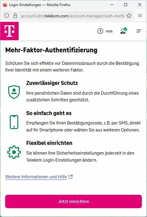 Weitere Informationen dazu finden Sie direkt bei der Telekom: Mehr-Faktor-Authentifizierung einrichten.