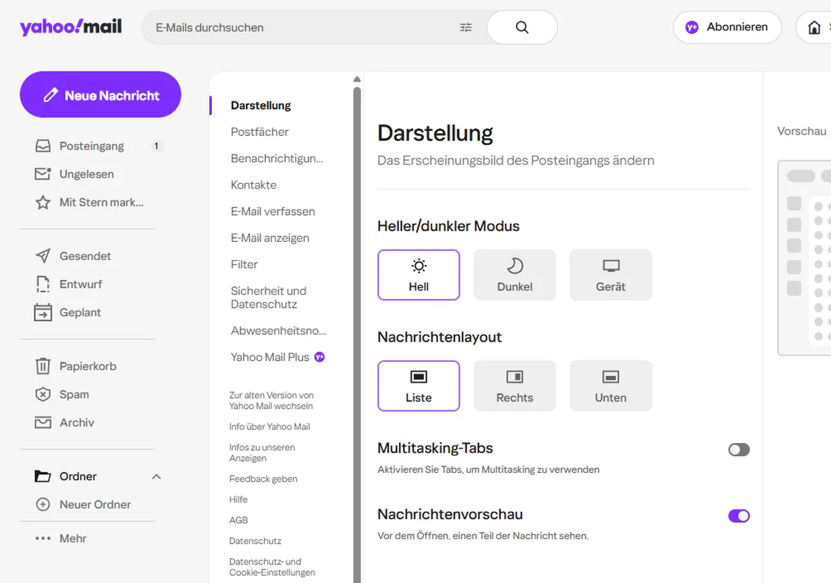 - Darstellung - heller oder dunkler Modus, Nachrichtenlayout (Liste, Rechts, Unten), Nachrichtenvorschau ein/aus