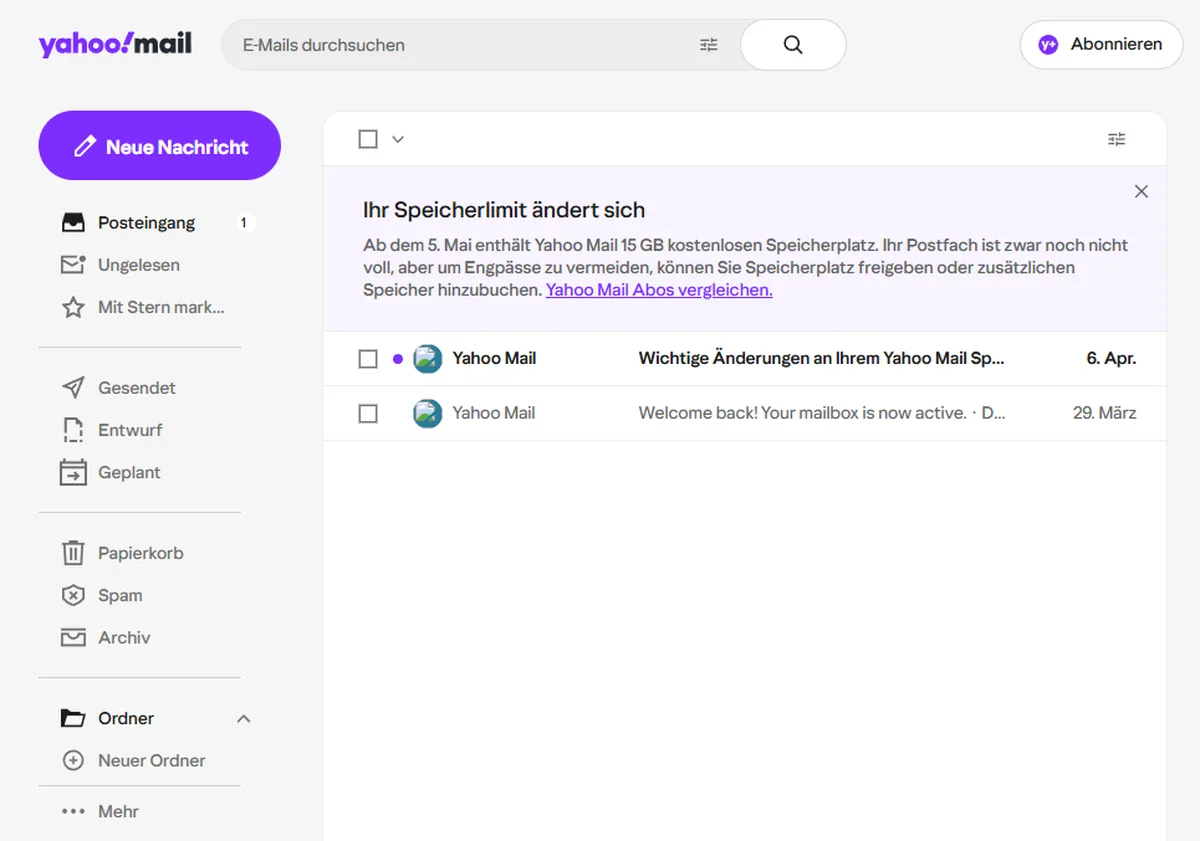 Ab dem 5. Mai 2026 reduziert Yahoo den kostenlosen Speicherplatz von 1 TB auf 15 GB. Yahoo informiert Nutzer mit einem Hinweisbanner direkt im Posteingang darüber.